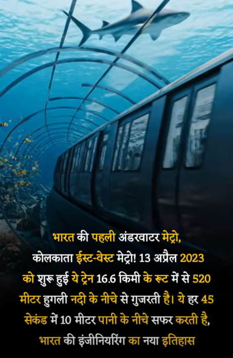 Kolkata East-West Metro! Started on 13 April 2023, this train runs on a route of 16.6 km, out of which 520 meters pass under the Hooghly River. It travels 10 meters below water in just 45 seconds, marking a new milestone in India’s engineering history.