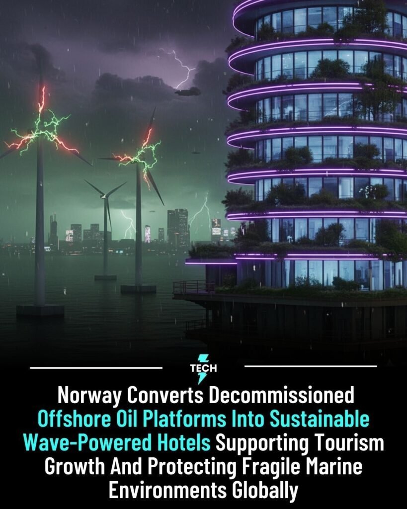 In a bold blend of restoration and reinvention, Norway is transforming its decommissioned offshore oil rigs into eco-friendly hotels powered entirely by wave energy, turning former industrial giants into symbols of sustainable tourism. Once towering emblems of fossil-fuel extraction, these massive platforms are being reborn as floating retreats, surrounded by open ocean, marine wildlife, and renewable power systems that operate without emitting a single gram of carbon. By anchoring new life onto old structures, Norway is proving that environmental progress and tourism can rise together from the same foundation.
